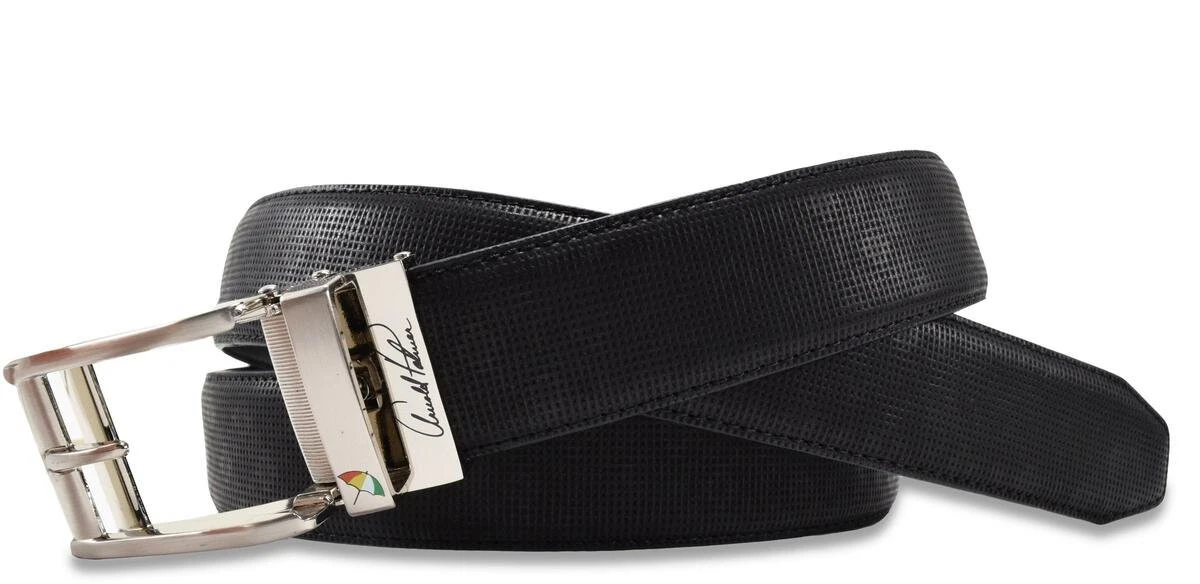 One Size Cut to Fit. 35mm cut to size, argyle pin-dot featheredge belt with click buckle with screen print Arnold Palmer logo.