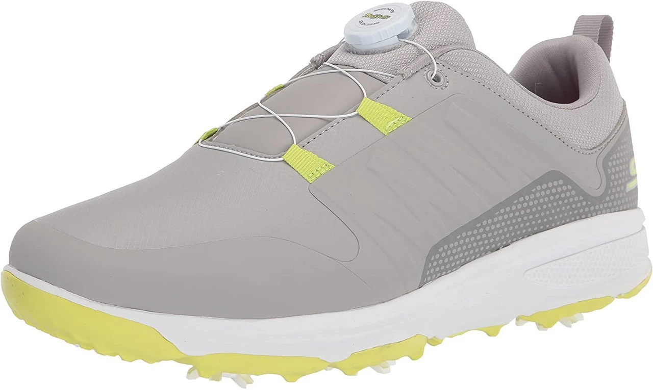 The Skechers torque twist golf shoe has a lightweight synthetic upper. Light enough that you’ll be asking to walk another 9 after you birdie hole 18. The ultra flight midsole is lightweight yet dense and responsive cushioning that is responsible for maintaining comfort. The gogh max insole delivers enhanced high-rebound cushioning, while the molded rubber grip bottom plate and replaceable soft spikes give you all the traction you need. Skechers H2GO shield provides the waterproof protection you need when the weather heads South. The twist dial lacing system gives you the freedom to customize your perfect fit.
